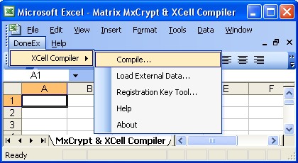 1. Download the DoneEx XCell Compiler from the www.DoneEx.com website and compile the XLS file format to the EXE file format. The result is a MS Excel file in the EXE format.